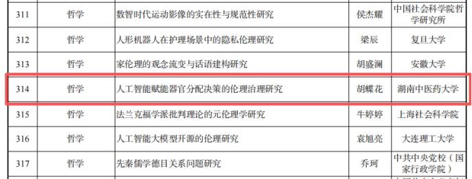 胡蝶花老师主持的研究项目《人工智能赋能器官分配决策的伦理治理研究》,获批2025年度国家社科基金青年项目立项。李雪晶老师主持的教学研究项目《中华优秀传统美育文化赋能高校“大思政课”建设的机理与路径研究》,获批2025年度教育部高校思想政治理论课教师研究专项一般项目立项。