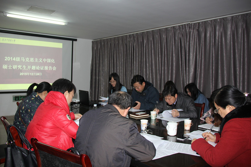 12月24日上午,马克思主义中国化研究2014级硕士研究生开题报告会在会议室举行。思政部主任李晖教授、易法银教授、毛新志教授、、陈小平教授、王超副教授作为评审专家参加会议。
