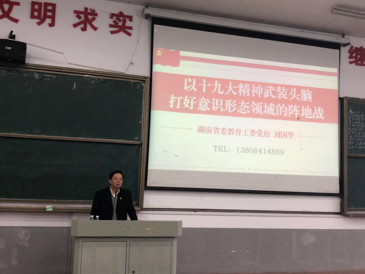 10月18日上午,马克思主义学院邀请湖南省高校干部培训中心主任、书记、省委教育工委常务副校长刘国华教授来我院进行讲座。刘教授面向2018级研究生作了题为《以党的十九大精神武装头脑 打好意识形态领域的阵地战》专题讲座。讲座由马克思主义院长叶利军教授主持,马克思主义学院副院长黄汀及全体思政课教师参加。