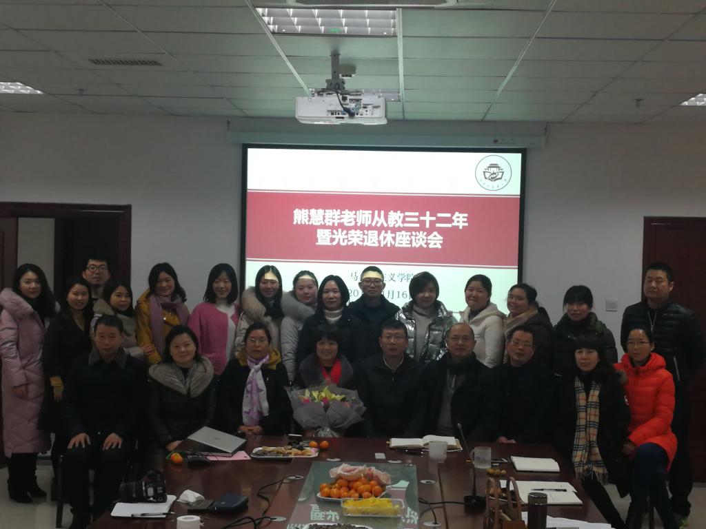 17日上午,马克思主义学院“熊慧群老师从教三十二年暨光荣退休座谈会”在院会议室举行。学院党政领导、全体教职工参加座谈并欢送其光荣退休。