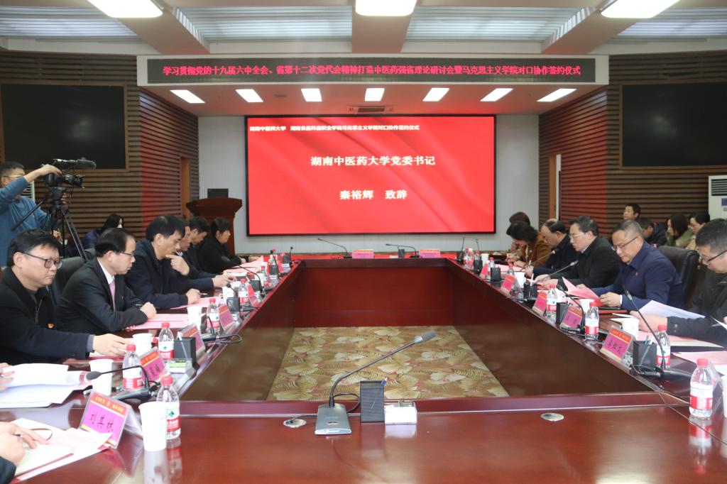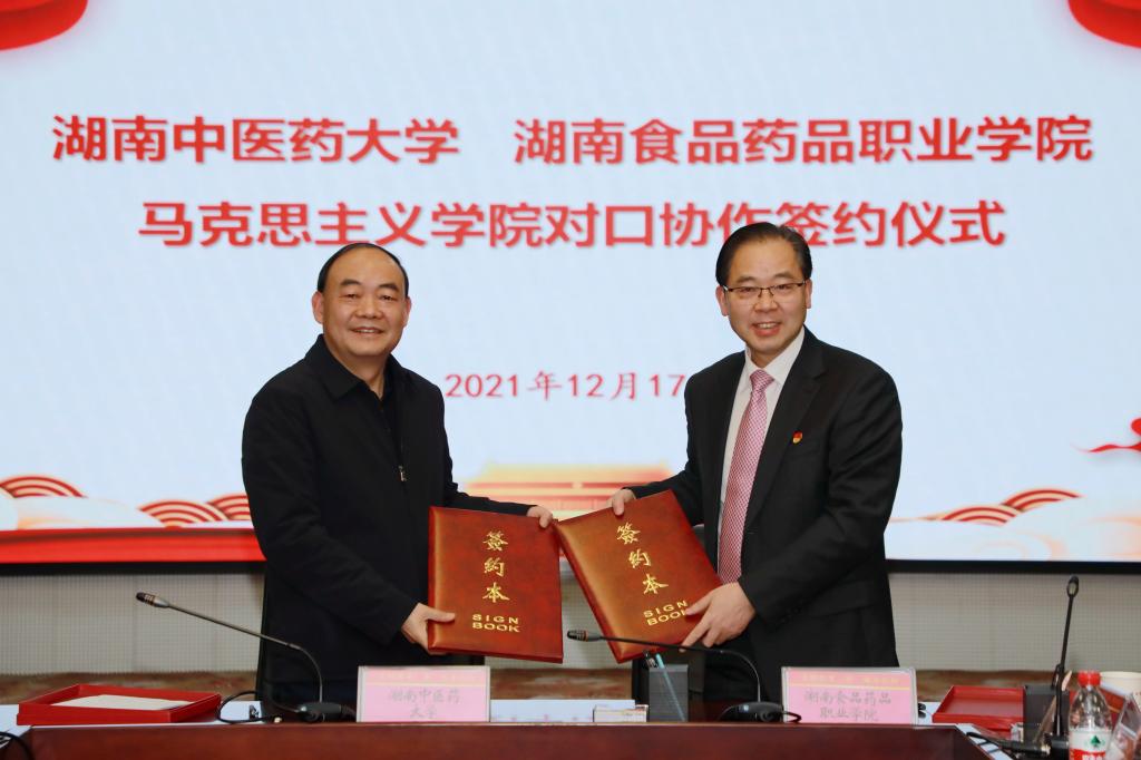 2021年12月17日下午,湖南中医药大学马克思主义学院与湖南食品药品职业学院思政部对口协作签约仪式在湖南中医药大学一办公楼一楼报告厅举行。