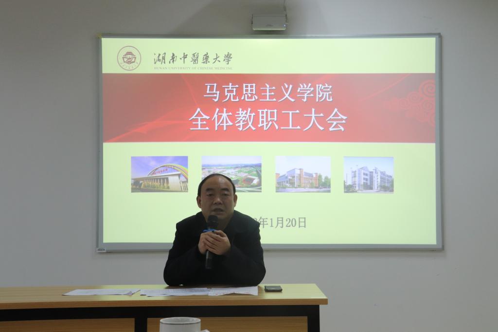 会议的第二阶段是全体教职工会议。首先,大学党委委员、副校长、学院党总支书记刘鸿翔教授通报了学院教职工在2021年度的各类科研成果、教学成果、评优获奖情况,并从“深化教学改革”“营造科研氛围”“打造一流师资”“加强党建工作”四个方面,肯定了学院2021年度的各方面工作。总结2021年工作后,刘校长对下一步工作提出了要求,重点强调要整合教学成果,打磨核心团队,提高学院的教学实力和能力;要更好地推进教学改革,加强思政课教学的时效和实效,提升广度和深度;要加强党建工作,为教学、科研等工作提供坚强的组织保证,以凝心聚力、激发干事创业精气神。