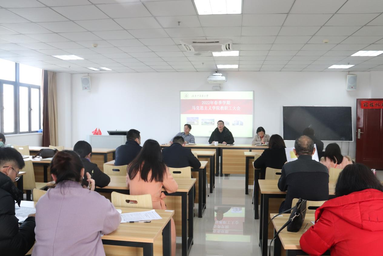 会议对新学期的重点工作进行了部署。李晖院长在讲话中强调:做好学院工作,离不开全体教职工的全力支持和积极参与。在新的一年,要继续加强疫情防控工作,进一步推动马院教学改革,统筹安排好基层教研工作,积极申报课题项目,认真完成课题要求。