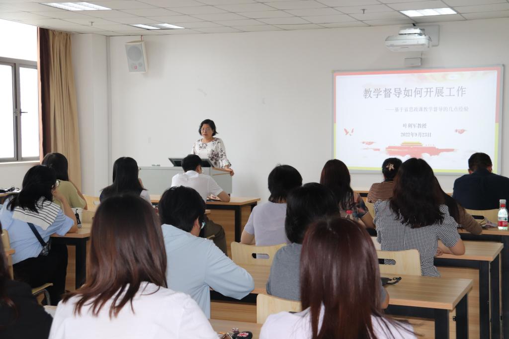 首先,我院叶利军教授给与会教师作了题为《教学督导如何开展工作》讲座。叶利军教授根据自己作为第二届省高校思政课教学指导委员会顾问委员及多次教学督导的经历,就教学督导如何开展工作、教学督导时关注的两方面重点内容跟在座老师进行分享,并据此向在座老师们提出了几点教学意见。