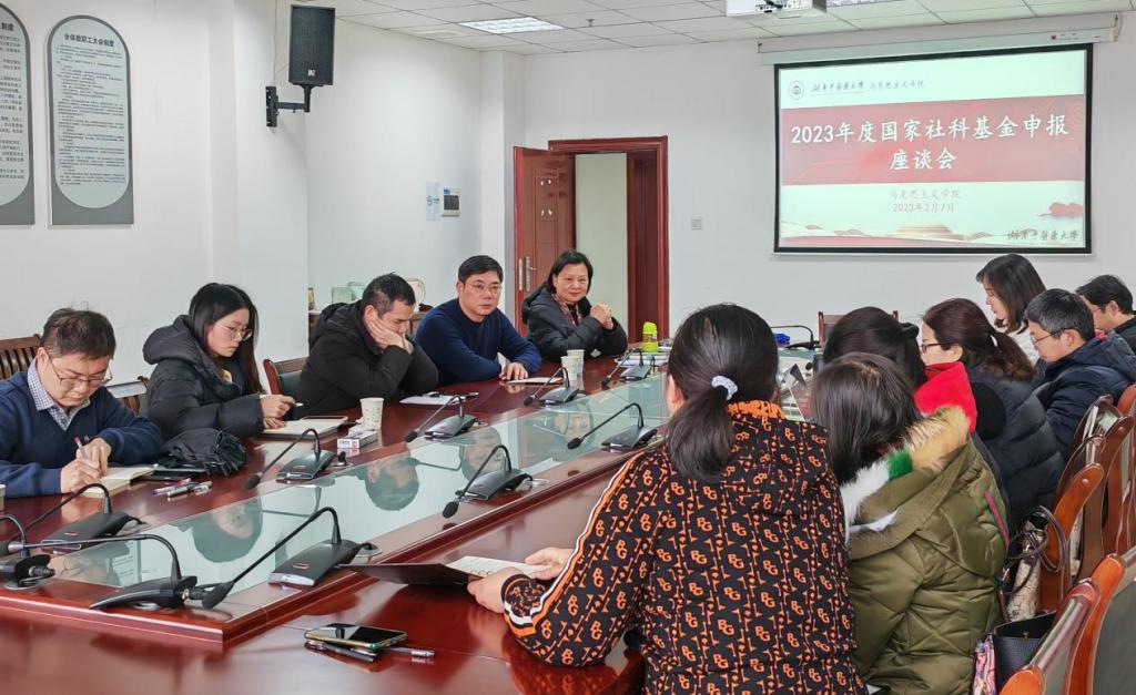 为做好2023年度国家社科基金项目申报工作,全面提升我院教师科研水平,2月7日下午,我院在三教904会议室召开了2023年度国家社科基金项目申报座谈会,就国家社科基金项目的选题及申请书的写作进行指导。长沙理工大学马克思主义学院院长、国家社科基金重大项目首席专家张明海教授,学院拟申报2023年国家社科基金项目的老师参加了此次座谈会,会议由学院副院长黄汀教授主持。