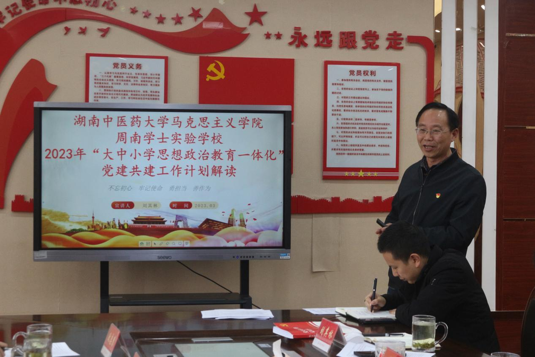 新湖南客户端3月29日(通讯员:蔡燕红 刘其林)为进一步贯彻落实习近平总书记关于扎实推进大中小思政课一体化建设的重要论述,3月28日,湖南中医药大学马克思主义学院、周南学士实验学校“大中小学思想政治教育一体化”党建共建工作推进会暨3月份“一月一课一片一实践”主题党日活动在周南学士实验学校举行。