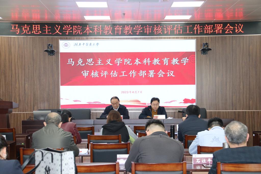 2023年4月7日下午,马克思主义学院在第三教学楼906会议室召开了本科教育教学审核评估工作部署会。我校副校长、学院党总支书记刘鸿翔主持会议,学院党政领导班子及全体教职工参加会议。