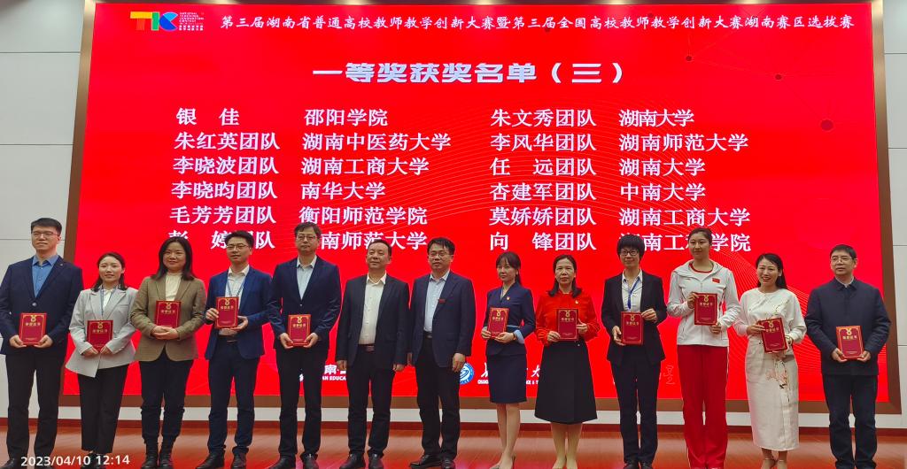 4月9日,由湖南省教育厅主办的2023年湖南省普通高校教师教学创新大赛在长沙理工大学成功举办。我院朱红英教授团队以基础课程组正高组小组第一名的成绩荣获大赛一等奖。
