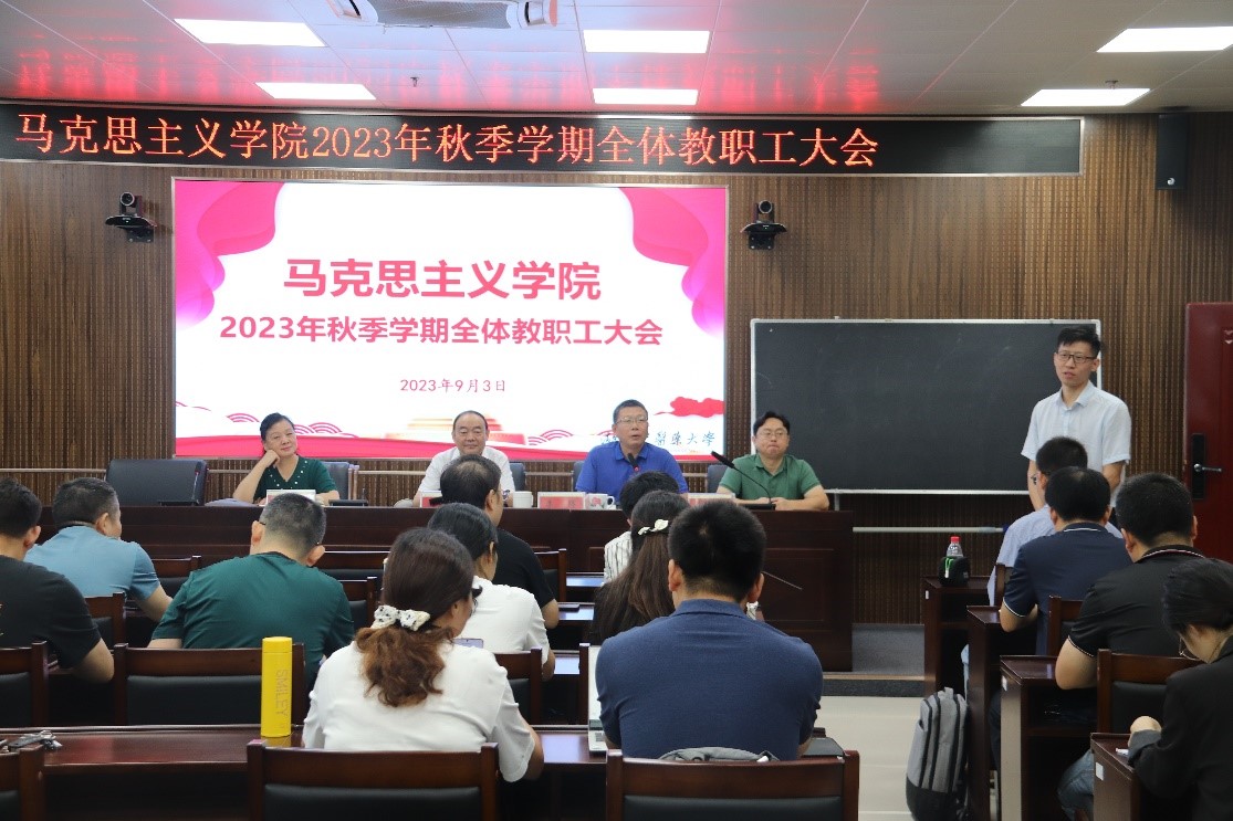 2023年9月3日上午,马克思主义学院在第三教学楼906会议室召开了新学期第一次全体教职工大会。大学副校长、马克思主义学院党总支书记刘鸿翔,院长李晖,副院长黄汀,副院长李红文以及全体教职工参加会议,会议由院长李晖主持。