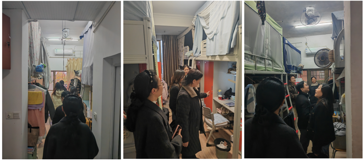 检查组一行重点排查了违规电器使用、私拉电线、消防通道堵塞等安全隐患,并对宿舍内部与公共区域环境卫生进行了细致检查。检查过程中,院领导与同学们亲切交流,强调安全是宿舍管理的底线,整洁环境是健康生活的基础,要求大家自觉遵守规章,共同维护宿舍环境的安全与整洁。