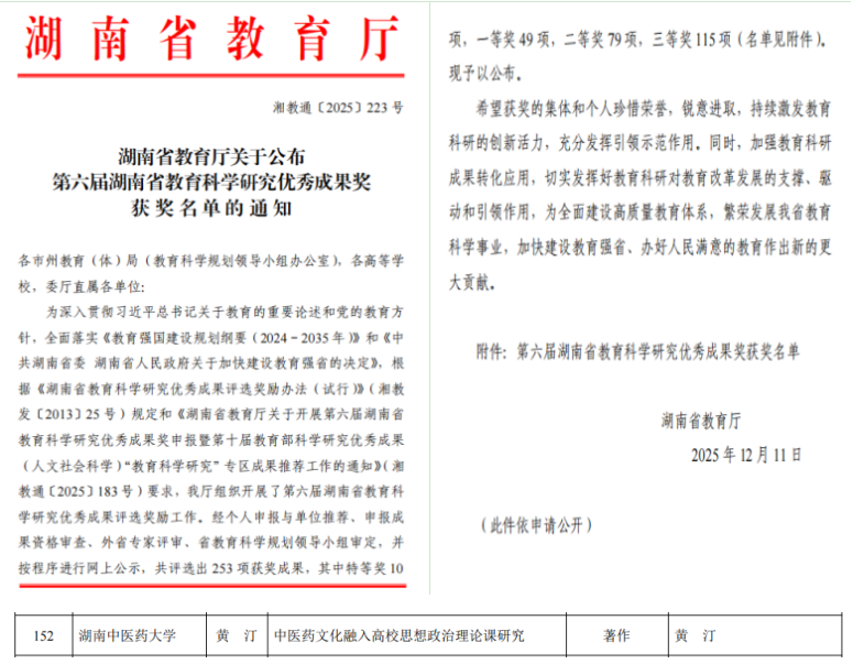 近日,湖南省教育厅公布了2025年第六届湖南省教育科学研究优秀成果奖名单,我院院长黄汀教授的学术专著《中医药文化融入高校思想政治理论课研究》获三等奖。